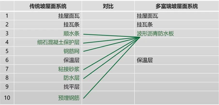 輕質(zhì)坡屋面系統(tǒng)的核心材料——波形瀝青防水板,替代傳統(tǒng)屋面中的順?biāo)畻l、混凝土保護(hù)層、鋼筋網(wǎng)等一系列工序,將各種工序集成到一張防水板中,使得整個(gè)坡屋面的構(gòu)造無比簡單。