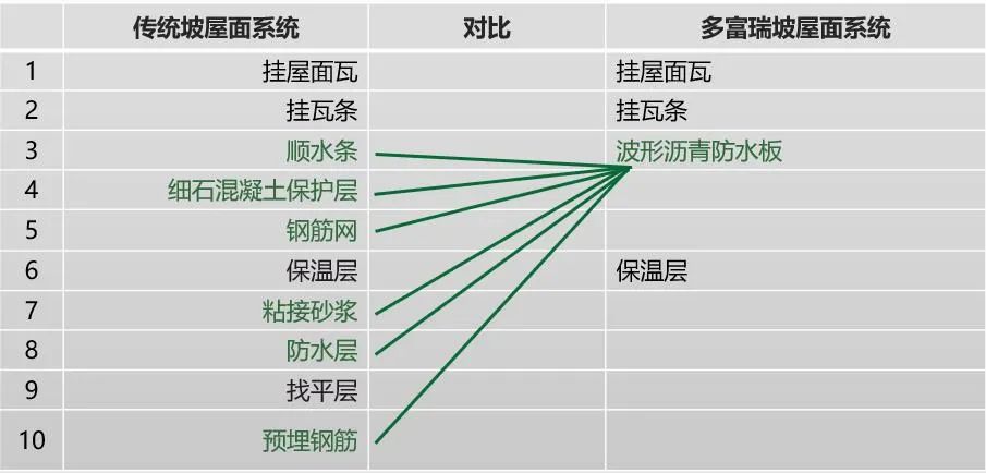 輕質(zhì)坡屋面系統(tǒng)的核心材料——波形瀝青防水板,替代傳統(tǒng)屋面中的順?biāo)畻l、混凝土保護層、鋼筋網(wǎng)等一系列工序,將各種工序集成到一張防水板中,使得整個坡屋面的構(gòu)造無比簡單。