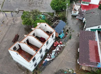 受災(zāi)嚴(yán)重的村子房屋以低、多層磚瓦房為主,大面積屋蓋瓦片被吹落,門窗受飛擲物破壞,部分門窗受風(fēng)吸力發(fā)生外吸現(xiàn)象。