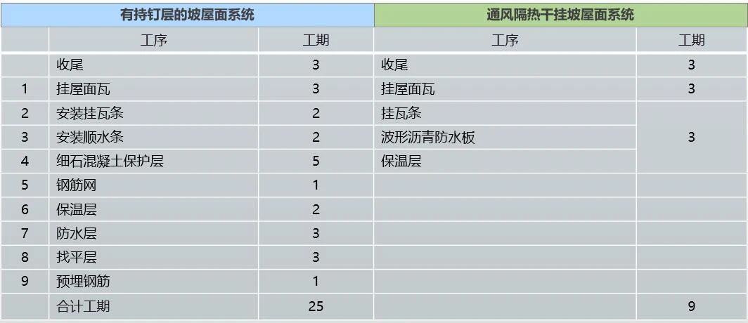 輕質(zhì)坡屋面系統(tǒng)施工極為方便,在屋面基層上鋪設(shè)保溫層、波形瀝青防水板,使用掛瓦條加以固定,再鋪設(shè)屋面瓦即可。以200平坡屋面為例,傳統(tǒng)的有持釘層的坡屋面系統(tǒng),需要25天的工期,而輕質(zhì)坡屋面系統(tǒng)僅需9天,約為傳統(tǒng)坡屋面做法的三分之一。