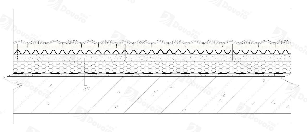 多富瑞輕質(zhì)坡屋面系統(tǒng)具有強(qiáng)大的適配性,可以在不同結(jié)構(gòu)的屋面基層上施工鋪設(shè)。在本項(xiàng)目中,波形瀝青防水板作為下覆層,搭配干掛陶瓦形成整個(gè)屋面系統(tǒng)。