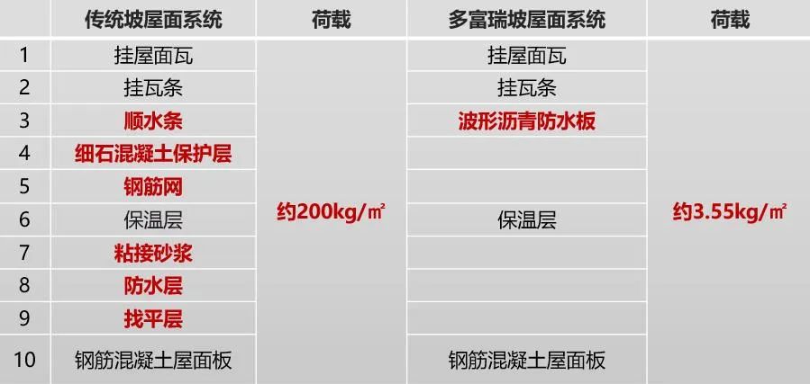 傳統(tǒng)坡屋面中的細石混凝土保護層、鋼筋網(wǎng)、砂漿、找平層都是重量大戶,每平米約200kg。波形瀝青防水板每平米僅重3.55kg,即可代替200kg的屋面構(gòu)造。